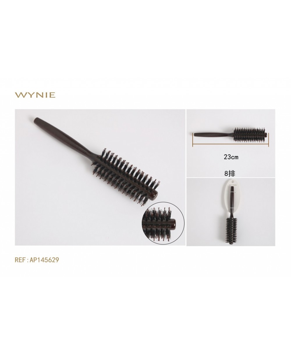 23CM ROUND HAIRBRUSH, BLACK PLASTIC, BROWN WOODEN HANDLE, REDUCES THE FRICTION BETWEEN COMB AND HAIR