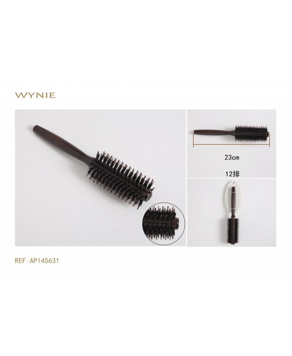 24CM ROUND HAIRBRUSH, BLACK PLASTIC, BROWN WOODEN HANDLE, REDUCES THE FRICTION BETWEEN COMB AND HAIR