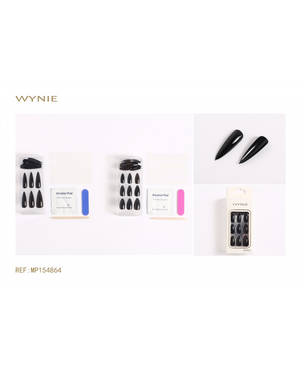 24 PIECES PLASTIC FALSE NAILS, WITH DOUBLE-SIDED ADHESIVE, WOODEN STICK, BLACK