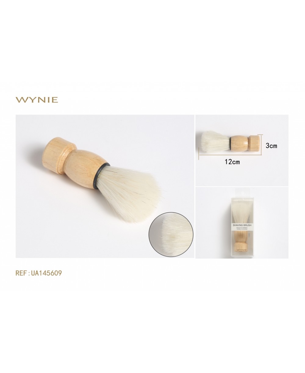 BROCHA DE AFEITAR DE 3*10CM, FABRICADA EN PP,BLANCA,CON MANGO DE MADERA,LA BROCHA ES SUAVE Y MUY ABSORBENTE.